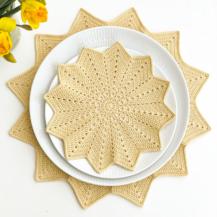 Her i opskriften har vi brugt den klassiske udgave i stangmasker, som passer til vores Organic Cotton. Den klassiske form kan sagtens stå alene som her, for når den er hæklet tæt med stangmasker, er den særligt velegnet til netop dækkeservietter og flakoner.