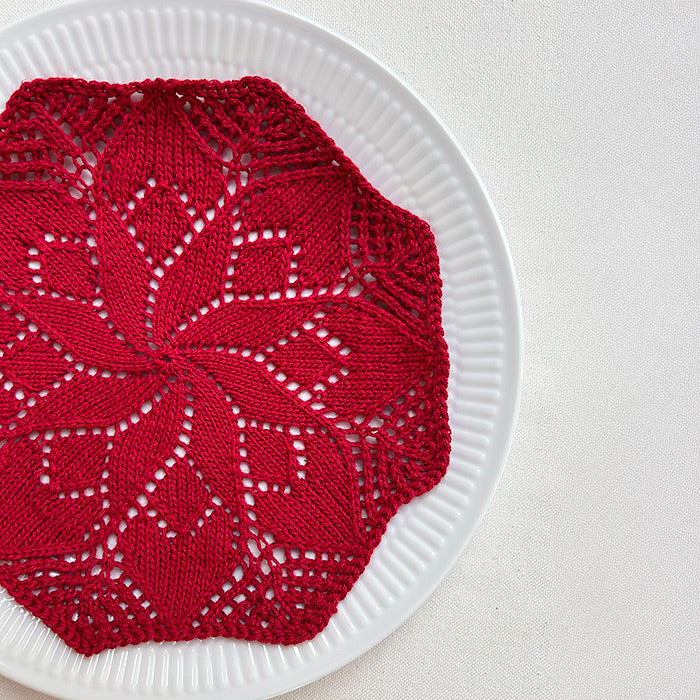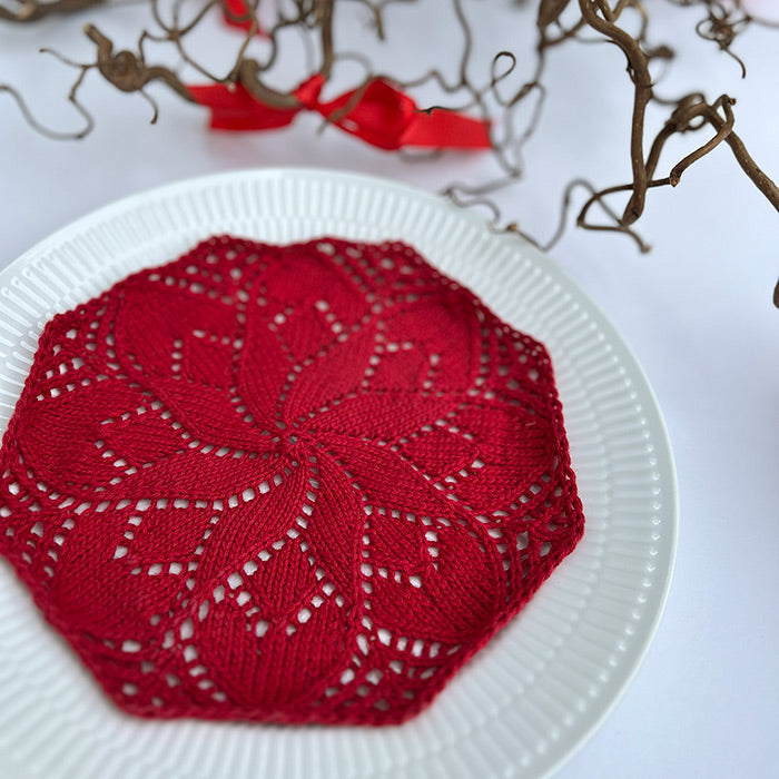 Med kittet kan du strikke 12-15 juleservietter af Krea Deluxe Organic Cotton i en smuk julerød farve.