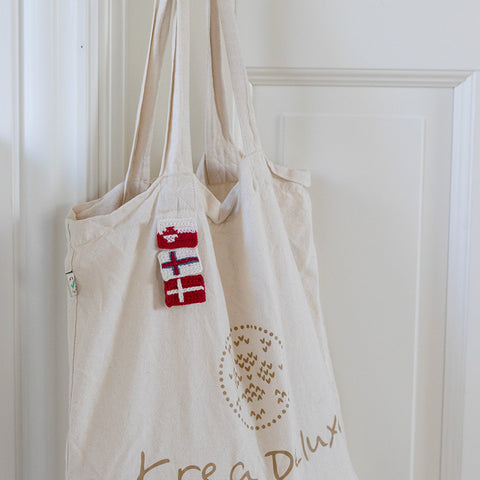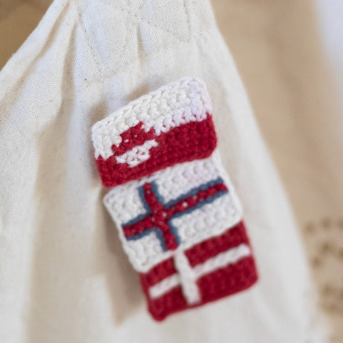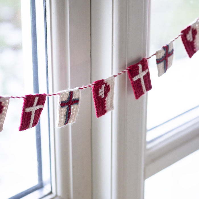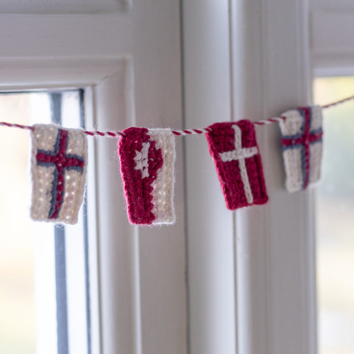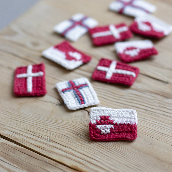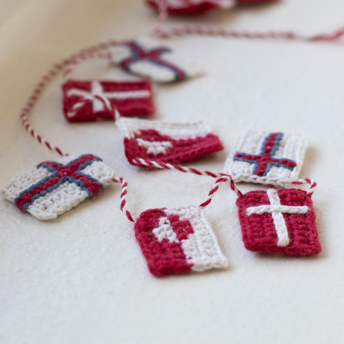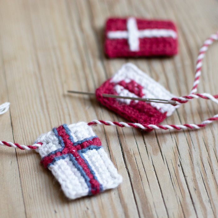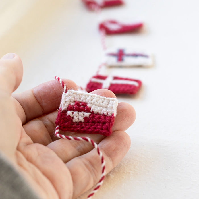 With this kit, you can crochet a mini flag garland featuring the three flags of the Kingdom of Denmark and the Danish Realm: the Greenlandic, the Faroese and the Danish flag. Three flags that complement each other and symbolize unity and shared history.