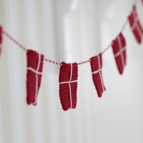 Gaven er et minikit til vores helt nye Dannebrogsflag. Med kittet kan du strikke eller hækle en fin Dannebrogsflagranke på 1,5 meter med 15 dannebrogsflag.